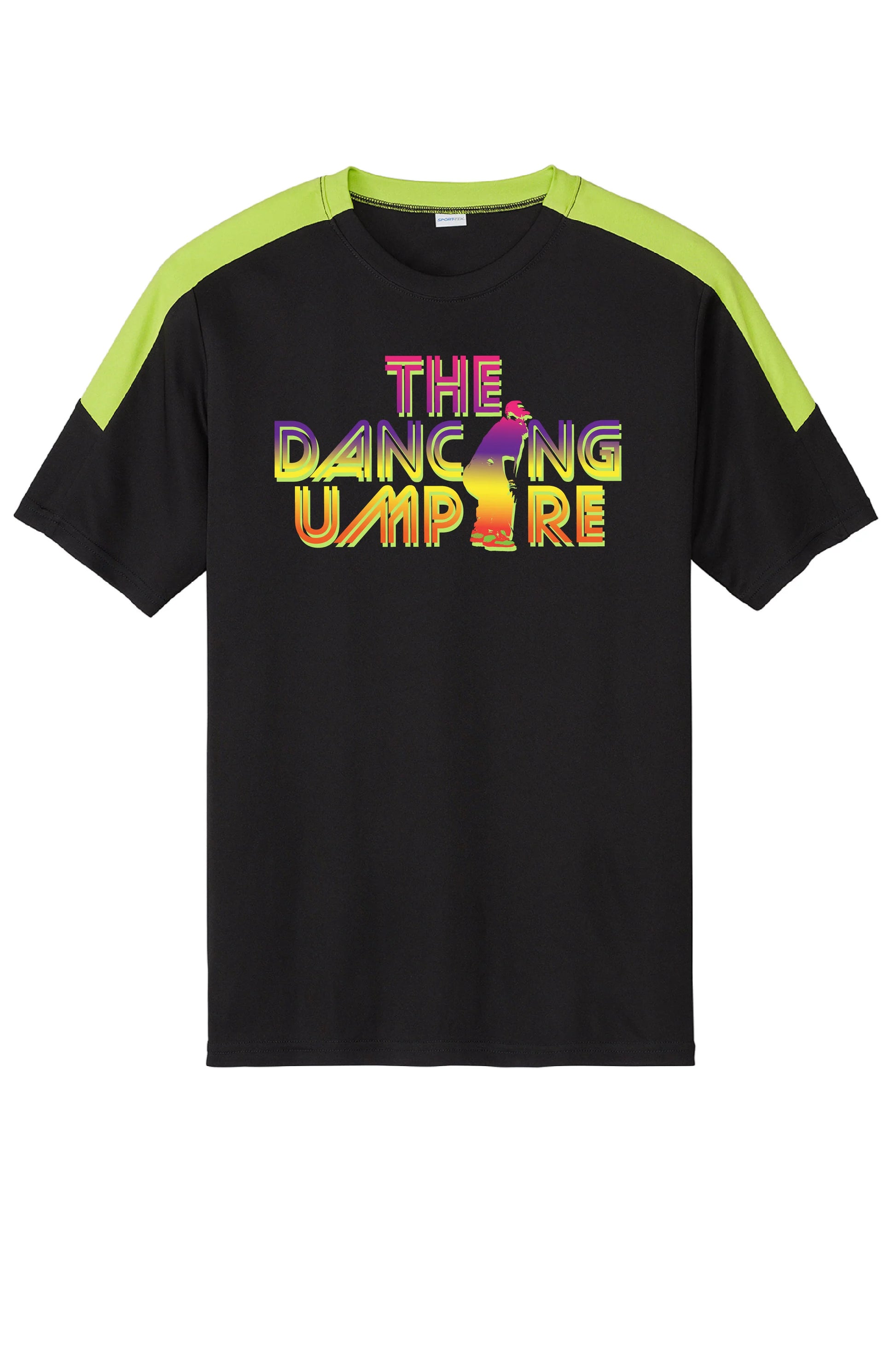 Black/Neon Green Sport-Tek Adult Dri-Fit Short Sleeve Shirt with "The Dancing Umpire" Distressed Logo on front